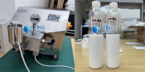 應天津大學浙江紹興研究院客戶需求,對樣品油水混合乳液開展實驗操作。此次實驗是在上海松江工廠科研室開展進行的,選用了凈信高壓納米均質(zhì)機JXNANO-15來對樣品油水混合乳液進行實驗操作。