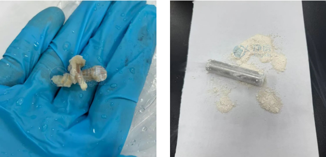 經(jīng)全自動液氮冷凍研磨儀處理后的大鼠股骨,成功變?yōu)榧?xì)膩粉末,無肉眼可見顆粒。后續(xù)檢測完全符合實(shí)驗(yàn)要求。