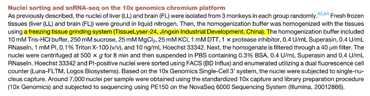 Tissuelyser-24L發(fā)揮了不可或缺的作用。研究團(tuán)隊(duì)利用這種凈信的組織研磨儀,從雄性獼猴的肝臟和大腦中提取細(xì)胞核,為后續(xù)的單細(xì)胞RNA測序(snRNA-seq)分析奠定了基礎(chǔ)。通過精確的細(xì)胞核分離和高質(zhì)量的樣本制備,研究人員能夠深入探究二甲雙胍對(duì)細(xì)胞老化的具體影響,從而揭示了其在延緩衰老中的分子機(jī)制。