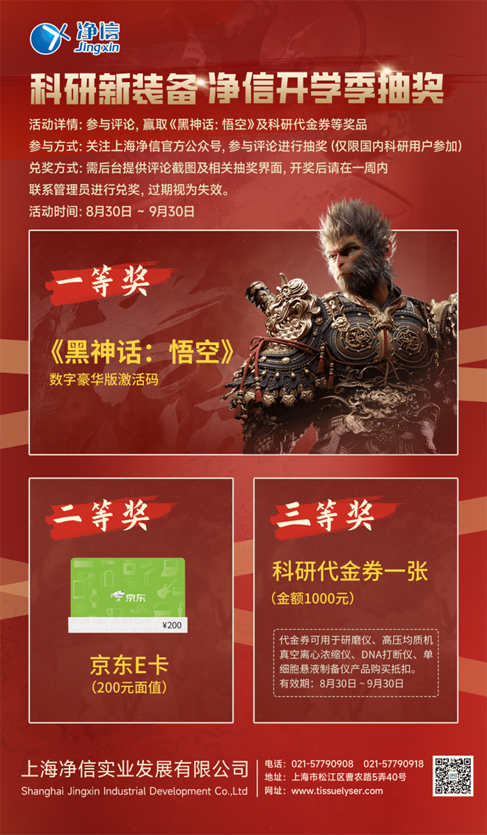 親愛(ài)的科研伙伴們,新學(xué)期伊始,是不是感覺(jué)你的實(shí)驗(yàn)室還缺點(diǎn)什么?上海凈信來(lái)幫你補(bǔ)齊裝備!參與我們的開(kāi)學(xué)季抽獎(jiǎng)活動(dòng),就有機(jī)會(huì)獲得《黑神話:悟空》數(shù)字豪華版激活碼,讓你的科研生活不再單調(diào)。不僅如此,還有京東E卡和科研代金券等你來(lái)拿,讓你的科研之路更加順暢!